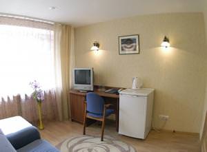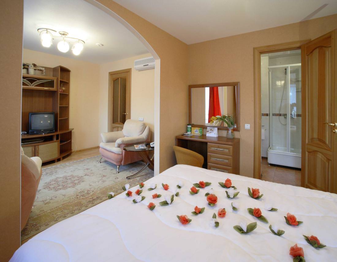 Просторный номер с одной двуспальной кроватью. В номере 2 комнаты, телефон, телевизор, холодильник, душевая кабина, фен, балкон, эл. чайник